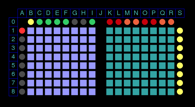Once in place, each instance is shown as a green button on the instance grid. If you press that button, the corresponding component will be shown in orange on the component grid and the input locations of that instance will be shown in orange on the instance grid. This allows you to read the graph of most circuits by "chasing the inputs".
